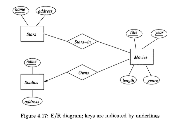 - In E/R diagrams, attributes that form a key for an entity set are underlined.