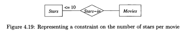 $<= 10$is placed on the edge from the relationshipStars-into the entity setStars. This limits the number ofStarsentities that can be connected to any singleMoviesentity.The standard arrow notations for many-one relationships are special cases of degree constraints.