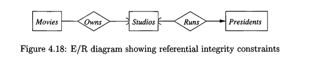 - In E/R diagrams, a rounded arrowhead pointing from a relationship \(R\) to an entity set \(F\) indicates not only a many-one relationship from another entity set \(E\) to \(F\), but also that the related entity in \(F\) must exist.